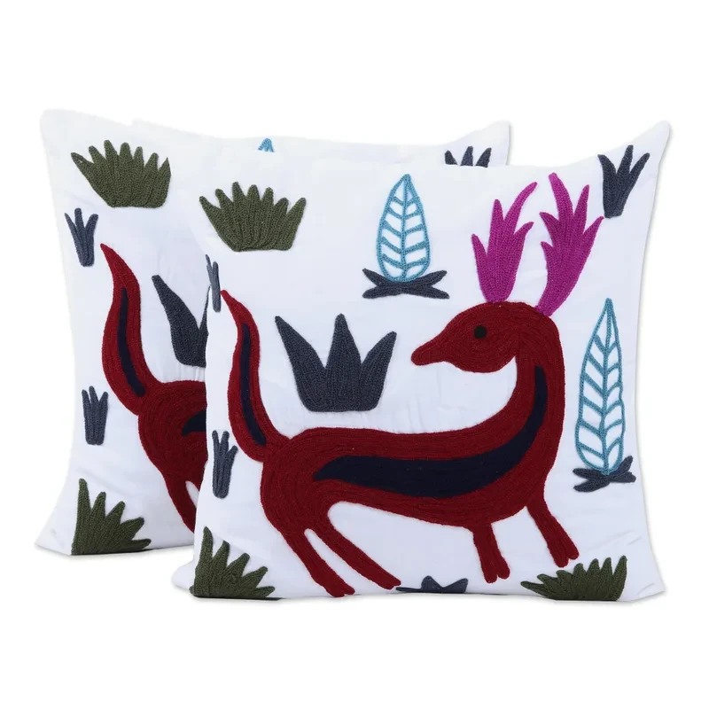 A deer stands majestically amidst the lust forest on this lovely pair of cushion covers. Designed by Amit Moza, they feature India's traditional aari embroidery, similar to chain stitch. White cotton fabric is embroidered in green, blue and grey to depict a folk art forest scene, while the reverse side is solid white. A slit at the back allows for easy insertion of a cushion.