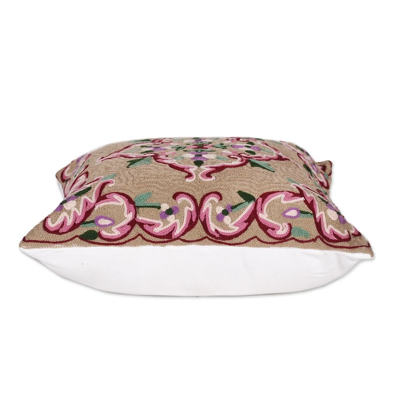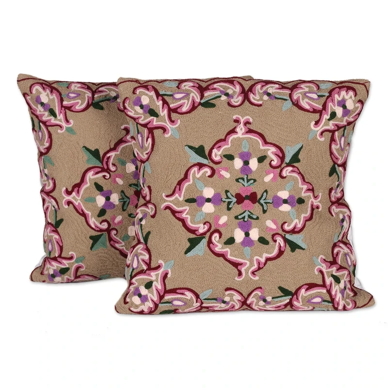 Relive an era of floral splendor and delicate elegance with this cotton cushion pair from the Indian region. Local artisans use the traditional chain-stitch embroidery technique to decorate the pair, merging pink and burgundy on a brown base hue. With every detail made of acrylic threads, the back also has a zipper for easy use.