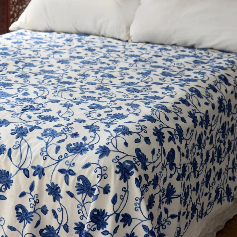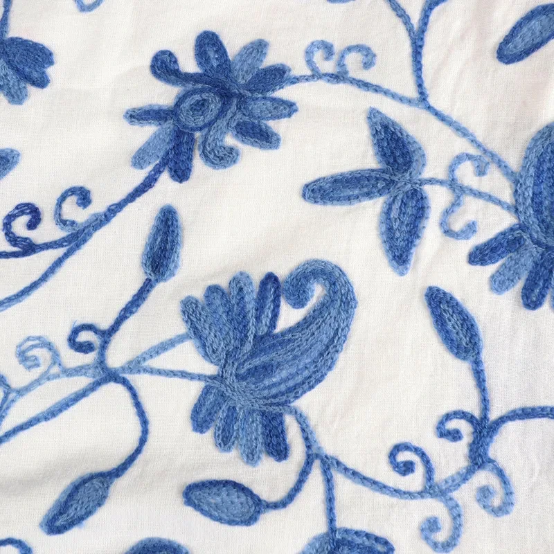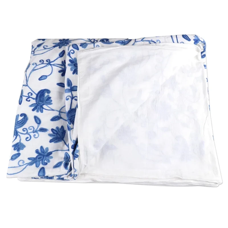Inspired by springtime in India's famous Kashmir Valley, Amit Moza designs this lovely duvet cover to beautify your bedroom. Hand crafted from 100% cotton, the cover features a chain-stitched floral motif that swirls over the white base in a deep blue color. Please note the duvet is sized as a full/queen and includes a tie string closure.