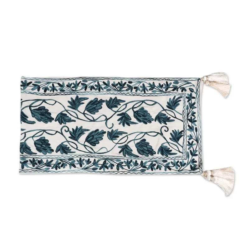 Celebrate the beauty of nature with this exquisite table runner designed by India's Amit Moza. Hand woven from 100% cotton, the table runner features a beautiful chain-stitched leaf and vine motif that swirls elegantly across an off- white background. Four tassels, one at each corner, give the runner an extra touch of loveliness.