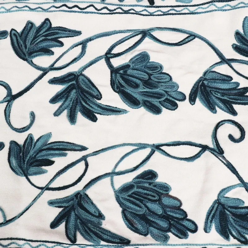 Hand woven from 100% cotton, the table runner features a beautiful chain-stitched leaf and vine motif that swirls elegantly across an off- white background.