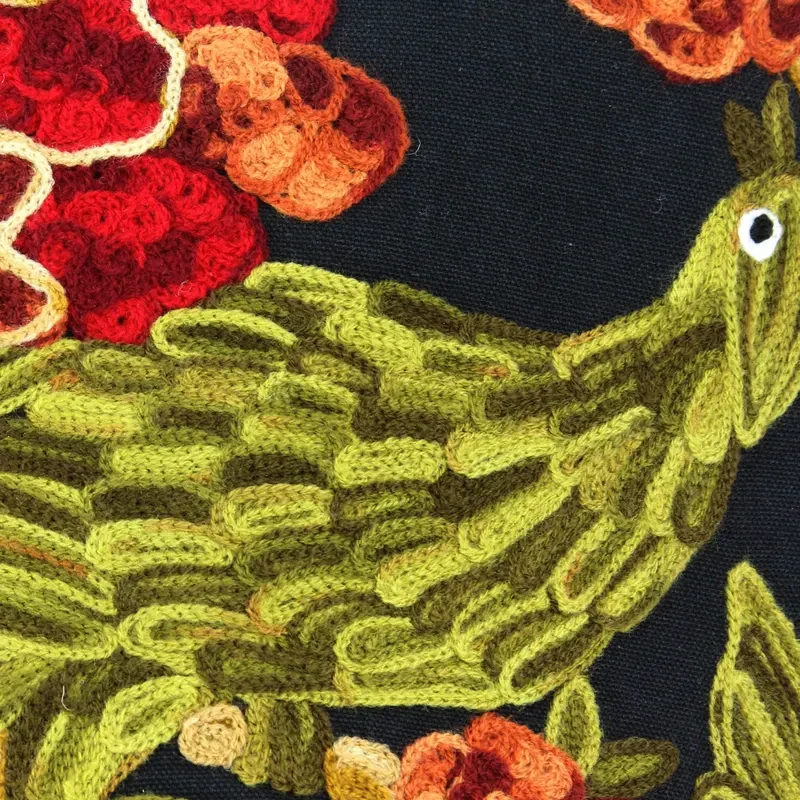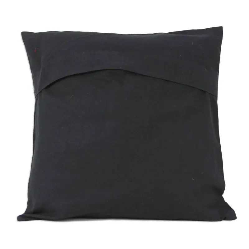 As darkness falls, the garden comes alive. A splendid green bird perches amid scarlet geraniums and a butterfly sips midnight nectar. Lavishly machine-embroidered, these dramatic cushion covers are designed by Amit Moza. The beautiful motifs are created with the aari chainstitch practiced in Kashmir and Gujarat. A slit opening at the back permits insertion of a cushion, and the reverse side is solid black.