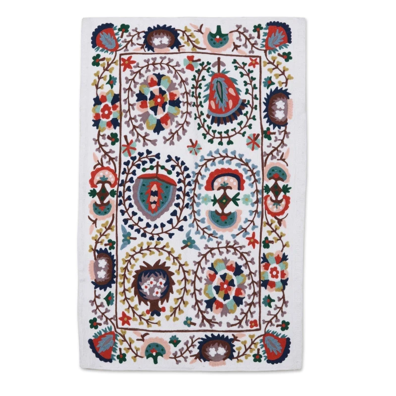 Natural and floral details come together in a cheerful design made with traditional Indian embroidery techniques and a Kashmir pattern, classic in the region. Amit Moza designs this cotton wall hanging in a colorful palette that enhances every little detail, creating a lovely aura that will fill your interiors with a warm and sweet sensation.