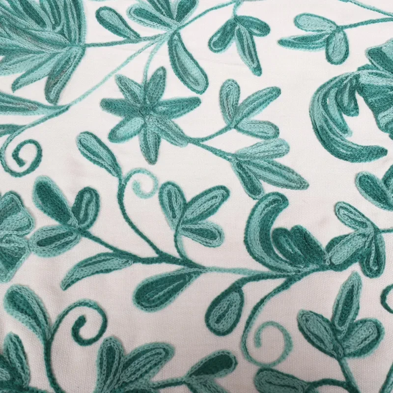 Hand woven from 100% cotton, the table runner features a beautiful chain-stitched leaf and vine motif that swirls elegantly across an off- white background.