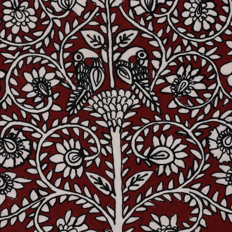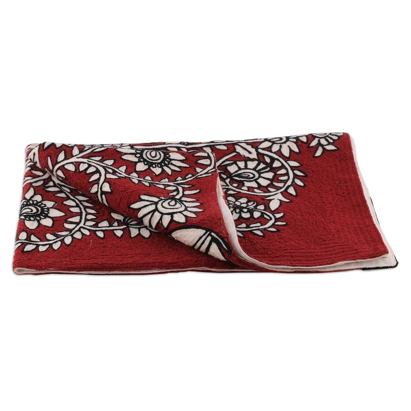 Two royal elephants rest under the shade of a magnificent tree, telling a tale of majesty and divinity. Designer Amit Moza works with a talented team to create this regal tapestry, made in honor of India's traditions. Refined wool threads in crimson, white and black hues form the piece, following a chain-stiched pattern.