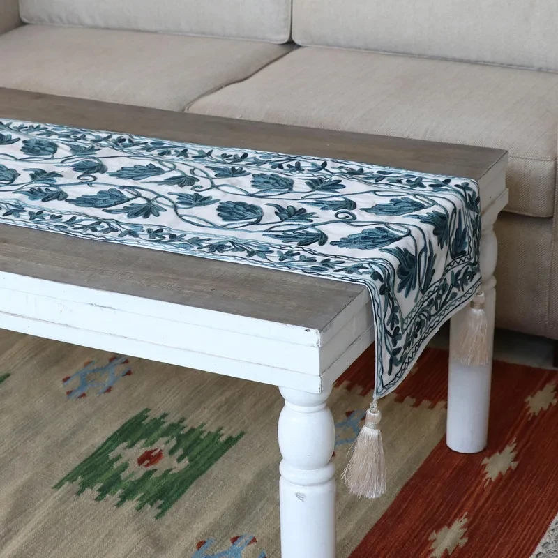 Chain Stitched Cotton Table Runner with Leaf Motif, "Kashmir Leaves in Aqua"