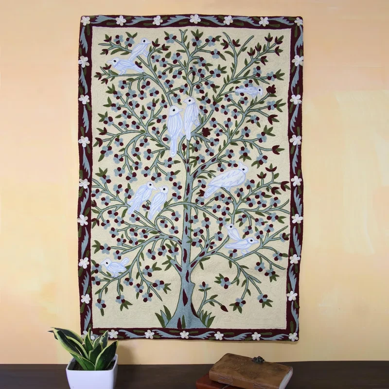 Hand Crafted Indian Chain Stitch Tapestry, "Abode of Birds I"