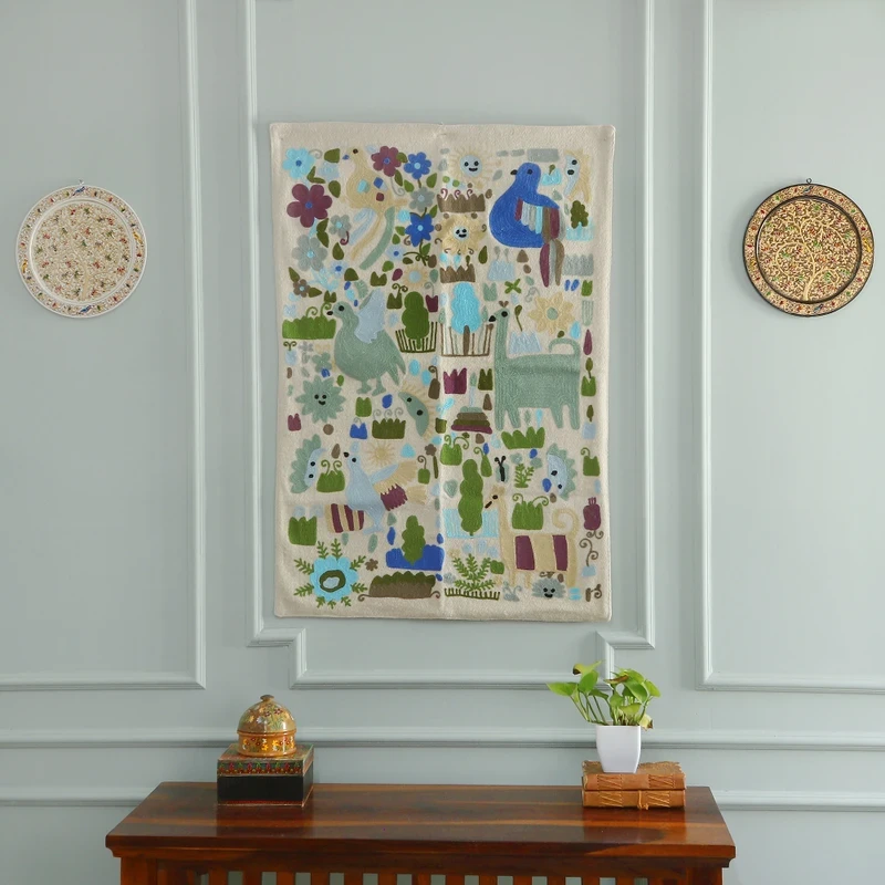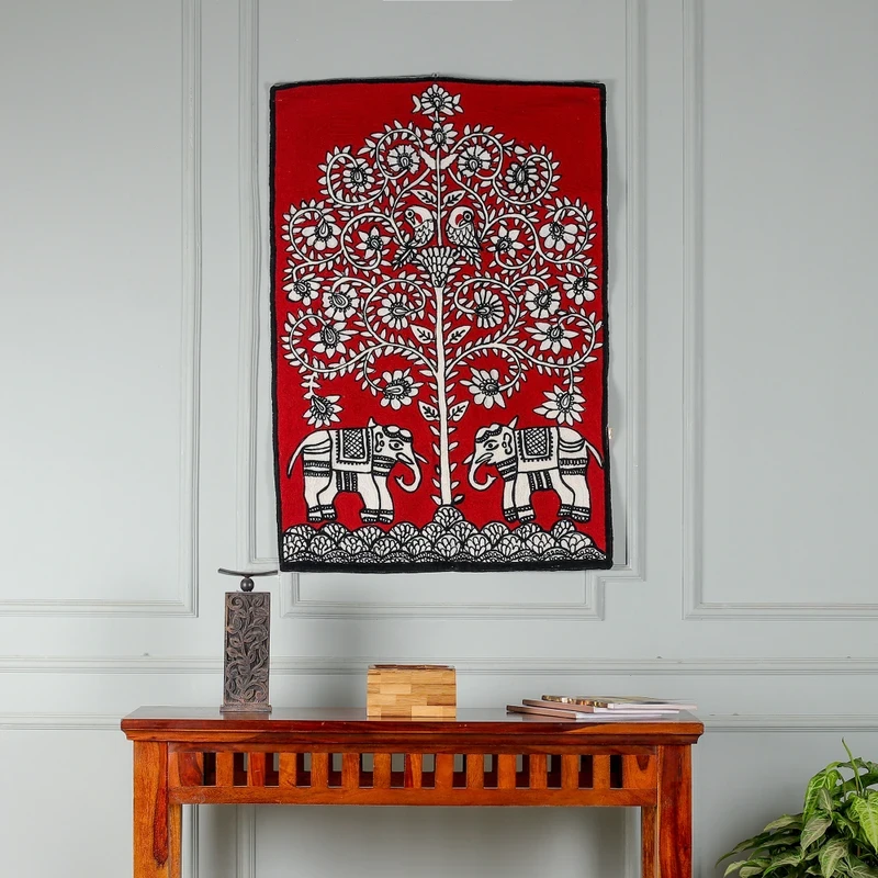 Indian-Made Traditional Crimson Wool Chain-Stitched Tapestry, "Harmony with Nature"